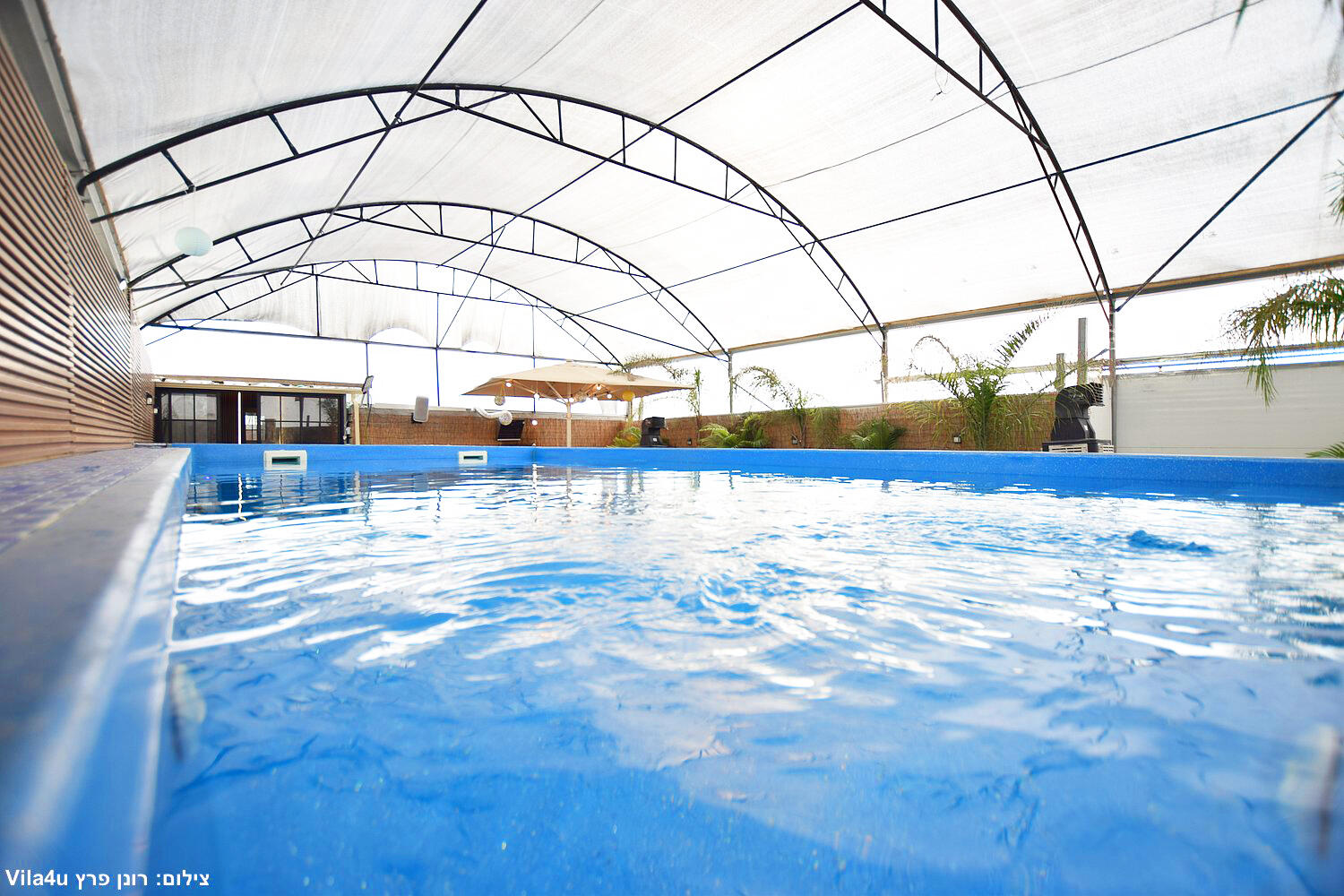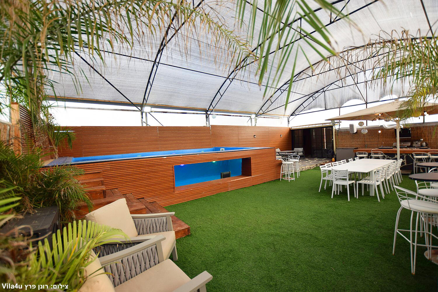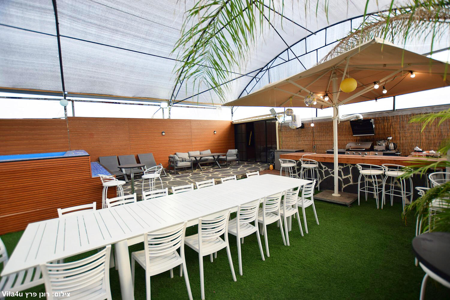 המתחם כולל בריכה צלולה, מדשאות ירוקות, מטבח חוץ מאובזר, פינות ישיבה ותאורה לילית קסומה.