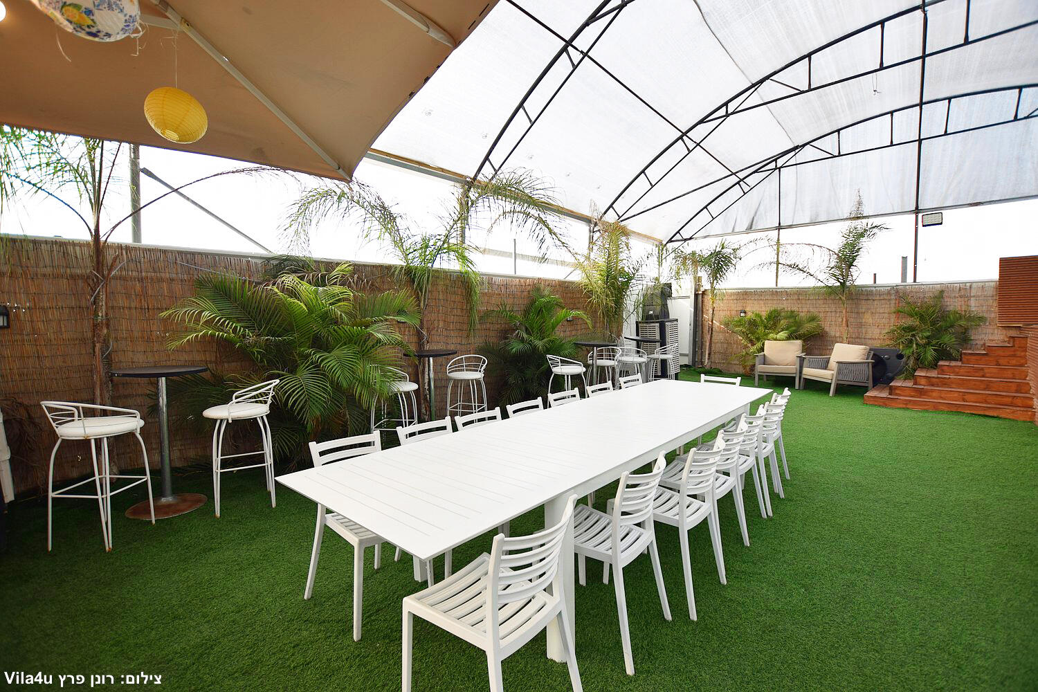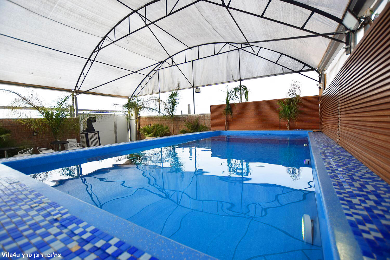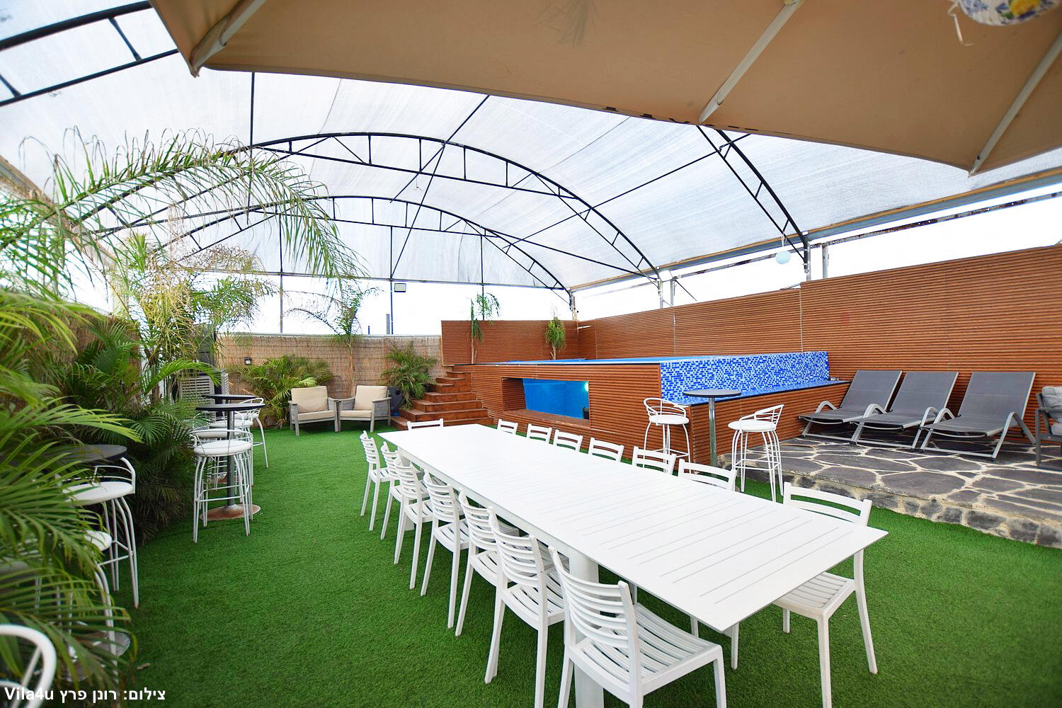 המתחם כולל בריכה צלולה, מדשאות ירוקות, מטבח חוץ מאובזר, פינות ישיבה ותאורה לילית קסומה.